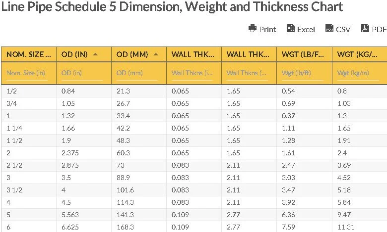 Line Pipe Schedule 5 Dimension, Weight and Thickness Chart