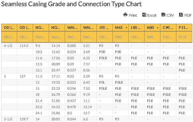 Oilfield Chart - Seamless Casing Grade and Connection Type Chart